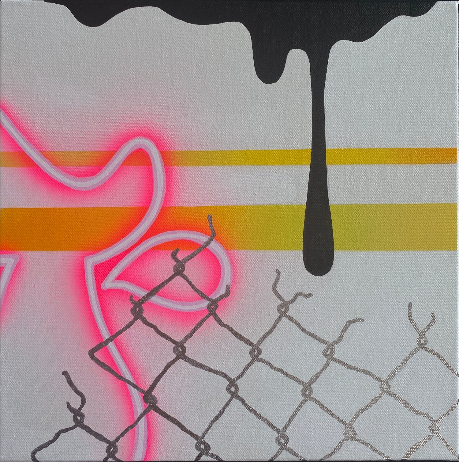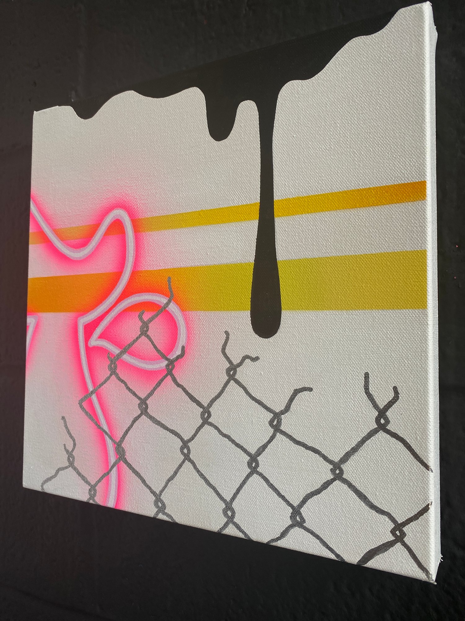 Built as a triptych but each piece was also designed to stand alone. These pieces take several elements of graffiti and collage them together. Blends or gradations of spray paint. Drippy black ink. Graffiti neon shapes and the act of trespassing.